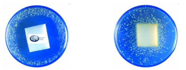 均有抗菌涂層樣片和常規(guī)涂層樣片(培養(yǎng)皿中間為被測(cè)試樣片)